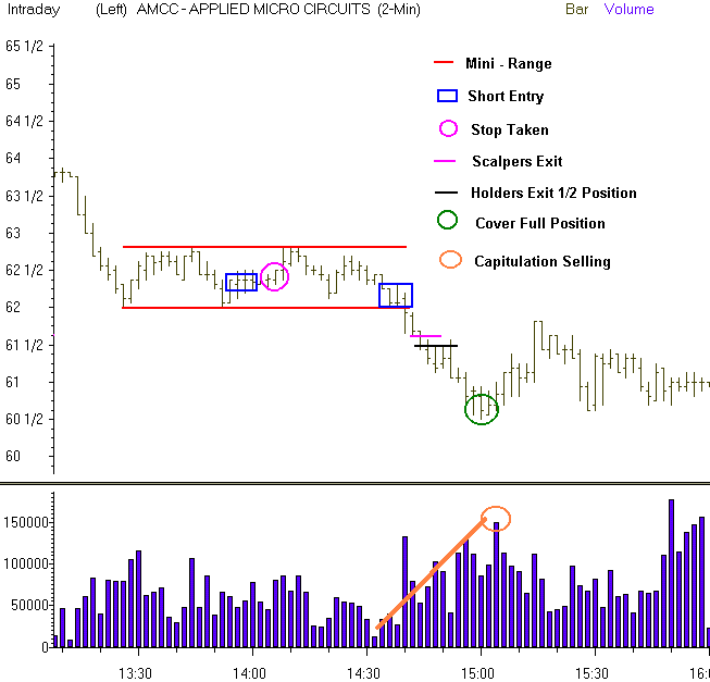 | 11/16/00 | <Chris> | Consider Shorting: AMCC 62 1/4 to 62 1/2...looking for break of low...62 1/2 high of current mini range, MLCO is holding it lower. |